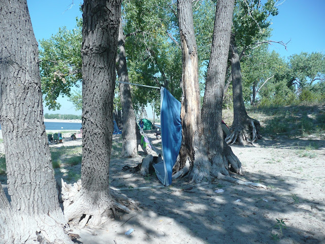Mark and Co had gotten into a little tiff about where to place their sleeping tent. My dear friend, Co, is really not the camping type when it comes to bugs and non-FUNCTIONING restrooms and so, bless her, she comes camping anyway but requires a bathroom close by. For her, CLOSE by, is just a few paces from the tent. For Mark, a half a block away did not seem unreasonable. My dear friend, Mark, loves to celebrate his birthday with camping and has a mind-set on how he wants to place the tents. So, for a bit, it was uncomfortable, with many of us offering our two bits to fuel the flame. Eventually, as they have for years, Mark and Co finally reached a compromise, which included Tanya moving their tent next to Becka and Mo's, whom had arrived just before the tent location debate. We wouldn't learn, until a day later, where the kids relocated to, in between the protection of two old cottonwoods,would be a much safer spot.